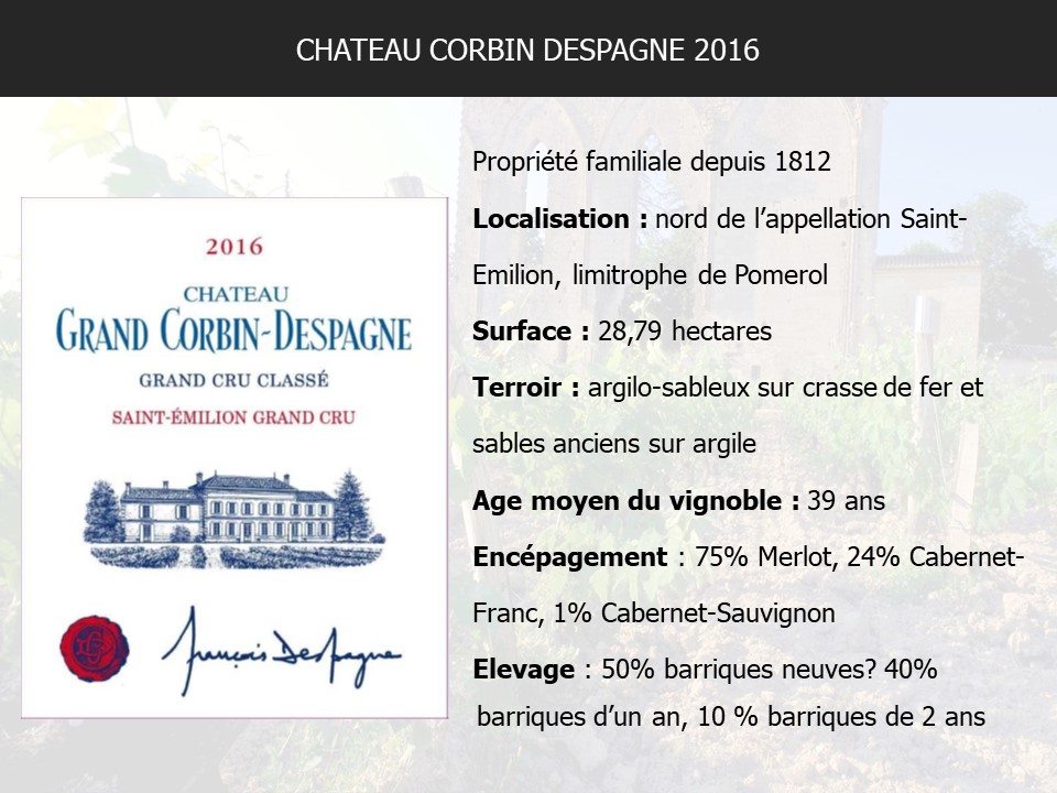 Voici un vin de terroir sablo-argileux et sableux, qui mérite encore des longues années de garde pour exprimer son plein potentiel. Le nez de ce Château Grand Corbin-Despagne est déjà aromatique sur des notes gourmandes de fruits rouges mûr, de vanille et de moka. L’attaque est ample et la bouche se révèle dense, avec une structure tanique encore ferme. Une légère amertume est équilibrée par la trame acide qui soutient une grande densité. La finale est longue sur des notes épicées.