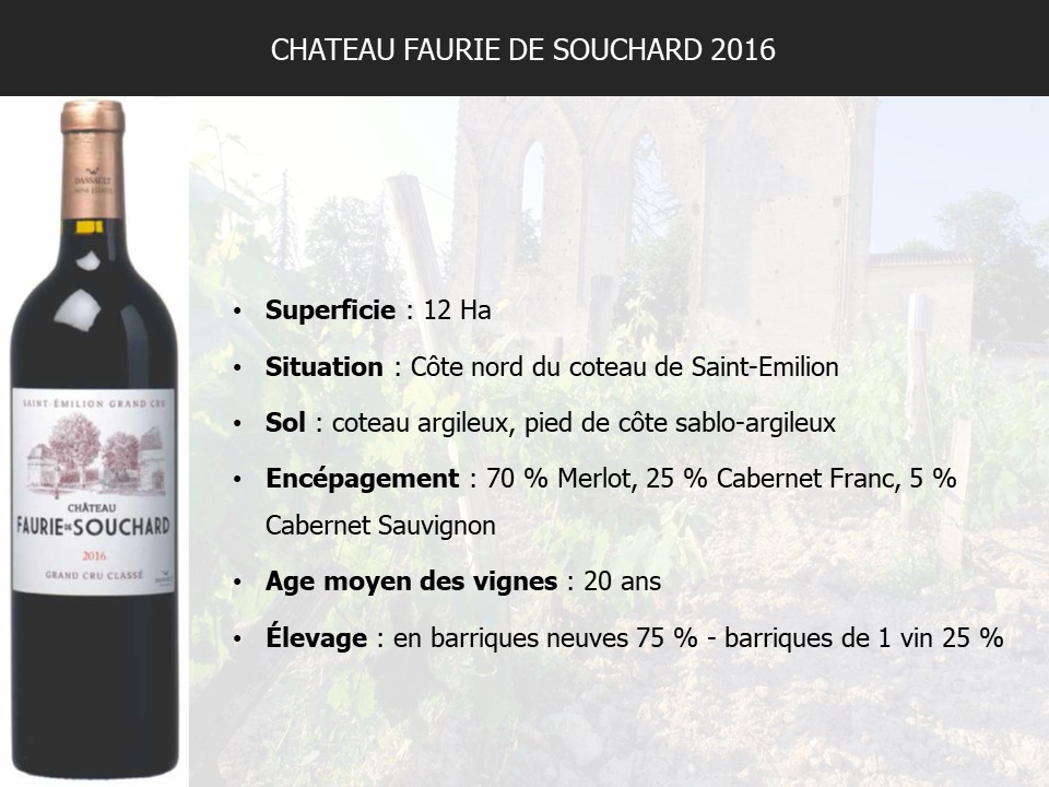 Sur des terroirs très proches, la sensation générale du Château Faurie de Souchard est similaire. Au nez on identifie plus de notes boisées – vanille, caramel – mais aussi un côté réglissé. La structure tanique est également semblable, avec des tanins ronds un tout petit peu asséchants et une grande largeur en bouche. Finale sur des notes grillées. A garder en cave précieusement.