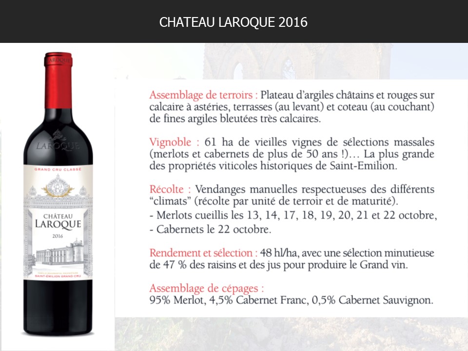 Changement de terroir avec des argiles sur calcaire. Château Laroque se révèle d’abord au nez avec un bouquet aromatique riche : fruits rouges, mûre, pointe de pruneau, notes florales et épices. Attaque plutôt vive comparée aux vins précédents, alors que le milieu de bouche offre une grande densité, très ample. La finale est longue.
