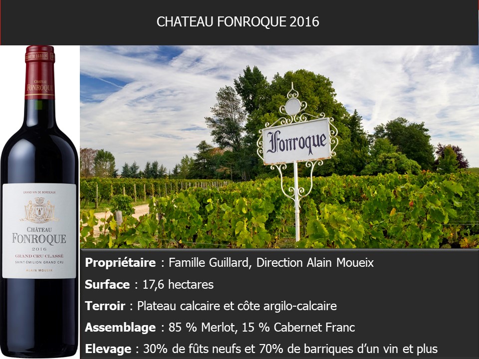 Sur un terroir similaire, nous clôturons cette superbe dégustation par Château Fonroque. Le nez est riche et délicat : floral, fruité, épicé et une touche poudrée. L’attaque est ample, enveloppante, avant de développer une mâche sensible, profonde avec un toucher de bouche superbe grâce à des tanins très fins. La finale est très longue. Magnifique !