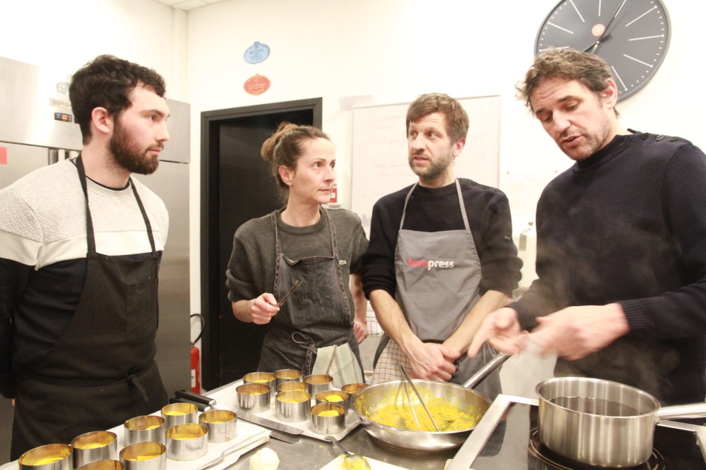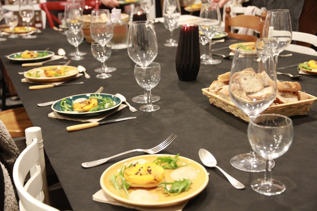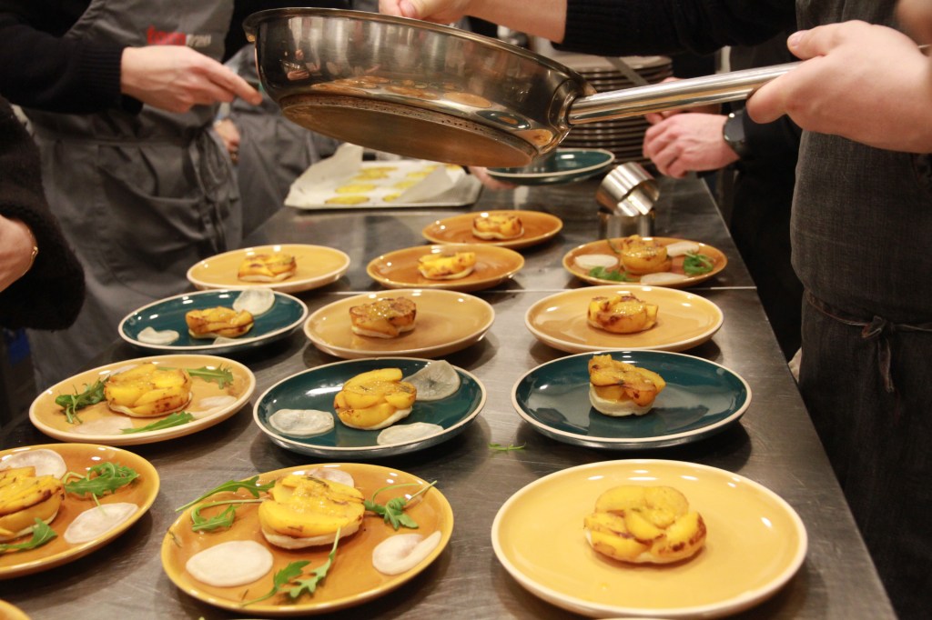- Entrée : tatin de navet boule d’or, pickles de navet marteau, orange, curcuma, romarin, grué de cacao /// champagne 1er Cru Clos de la Chapelle & Crémant de Bordeaux Louis Vallon